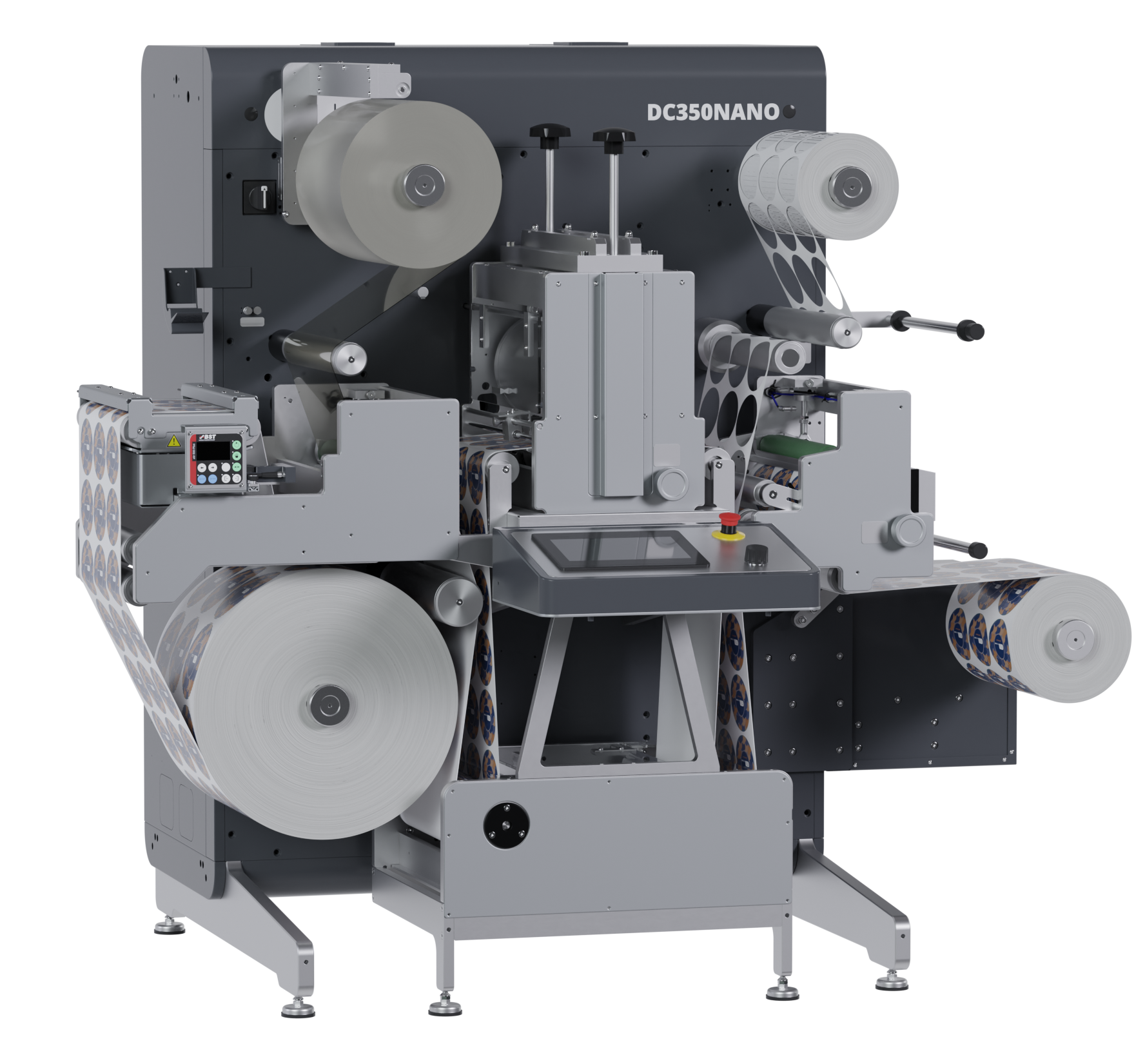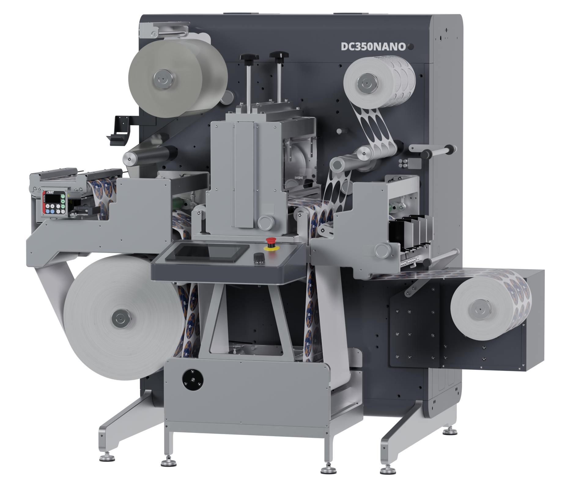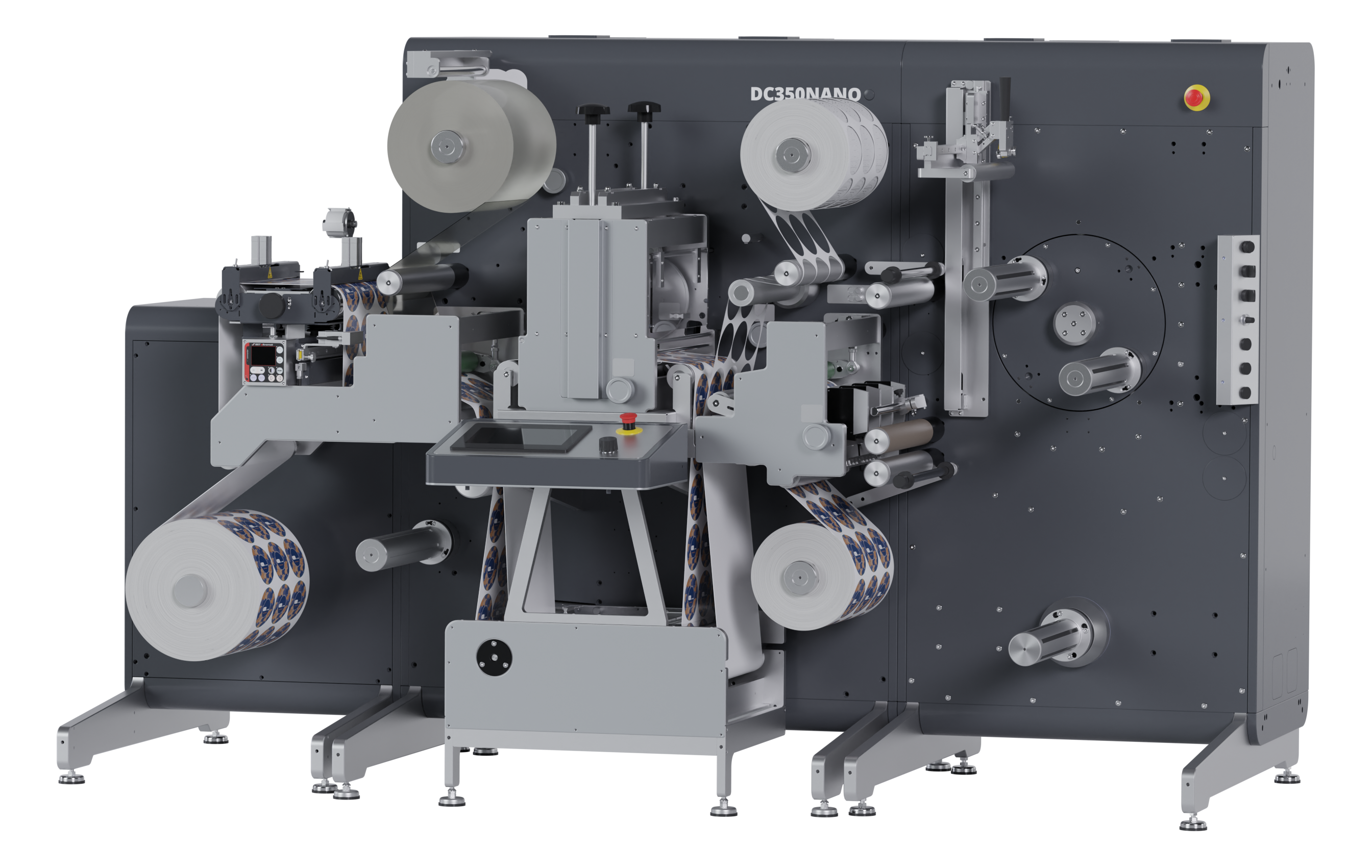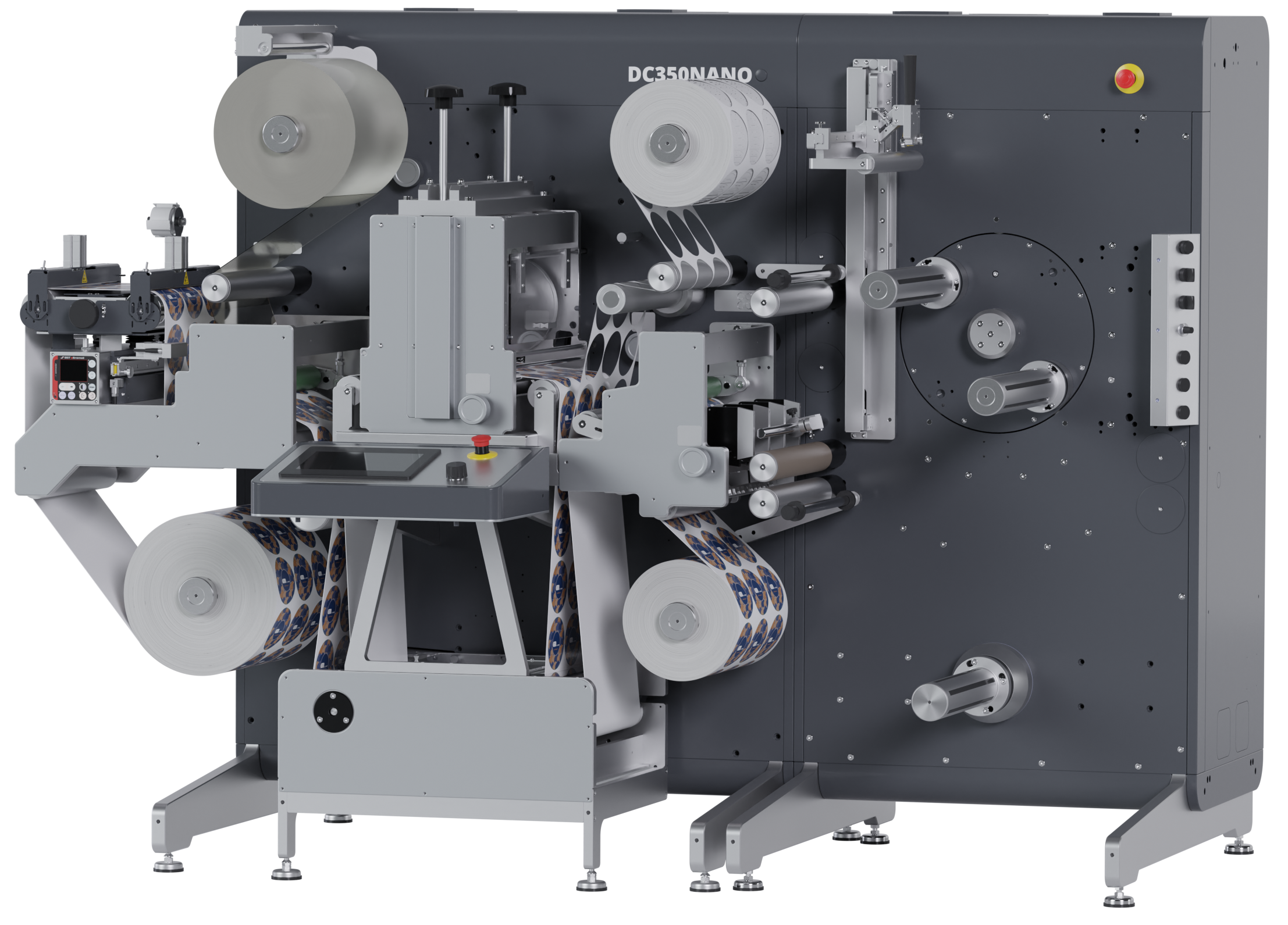A solid 20 mm metal frame provides a vibration-free base for the four powerful servo motors that drive the web. The DC350Nano can be configured as an inline extension to a digital label press, allowing the web to continue directly from printing to converting, or it can operate as a standard offline finishing unit.