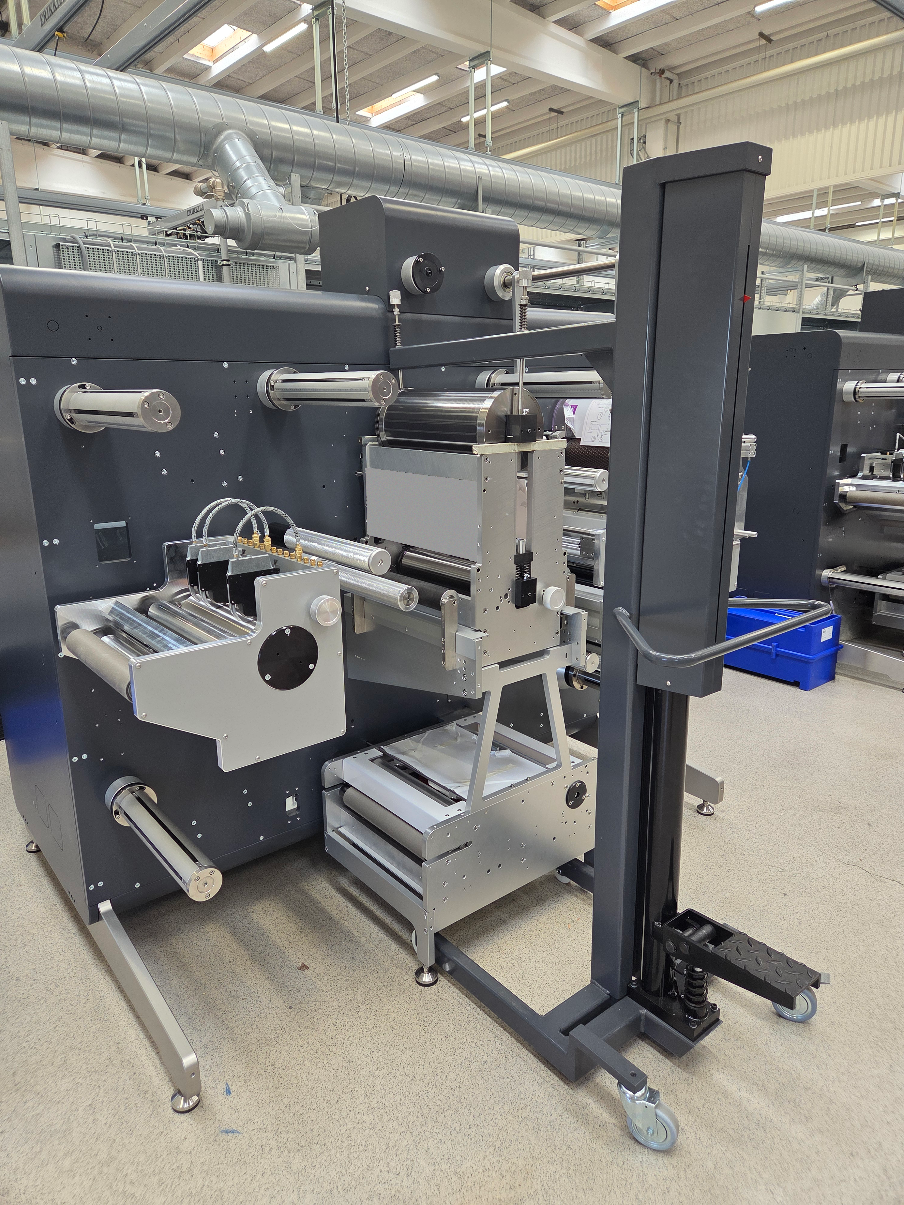 The rear wheel is fitted with a secure brake to ensure the roll lifter remains stationary when necessary. This feature is particularly useful for maintaining stability during the installation or removal of a die-cut cylinder, and when placing a roll of substrate onto the unwinder spindle or removing it from the rewinder.